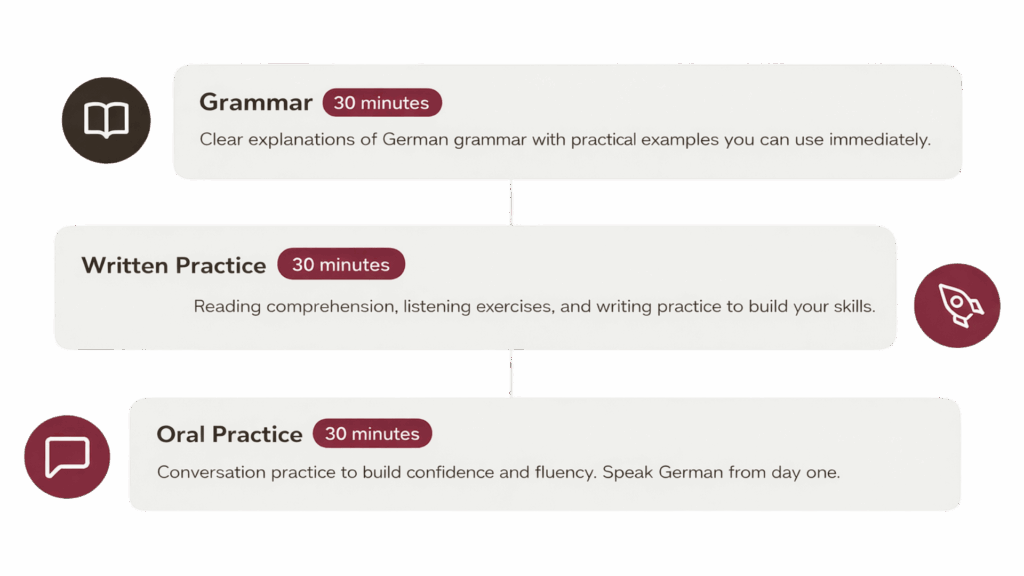 These courses are ideal for students who want to learn German seriously but need flexibility. They’re perfect if you work, live outside Vienna, or prefer learning from home without losing quality or personal guidance.