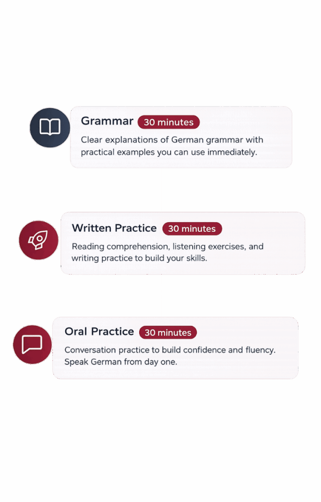 Our courses focus on using German in real-life situations. Grammar is important, but the main goal is to help you understand, speak, and feel confident in everyday and professional contexts.
